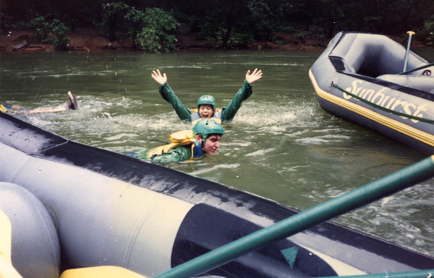The Ocoee is an exciting river, but it's certainly not relaxing. Except for here. Guides pull the rafts over at this pool and let everyone go swimming. It's a lot of fun after two hours of breathtaking maneuvers. The older rafts needed to be pulled over more often and flipped over to bail out the water after each set of rapids. As you can imagine, those are heavy and awkward rafts and the ritual got old. Now, the rafts are high tech self bailing models. The bottoms include valves which, as they flex up and down, push water out but do not let it in. The bottoms thus stay fairly dry. |