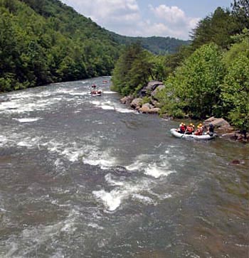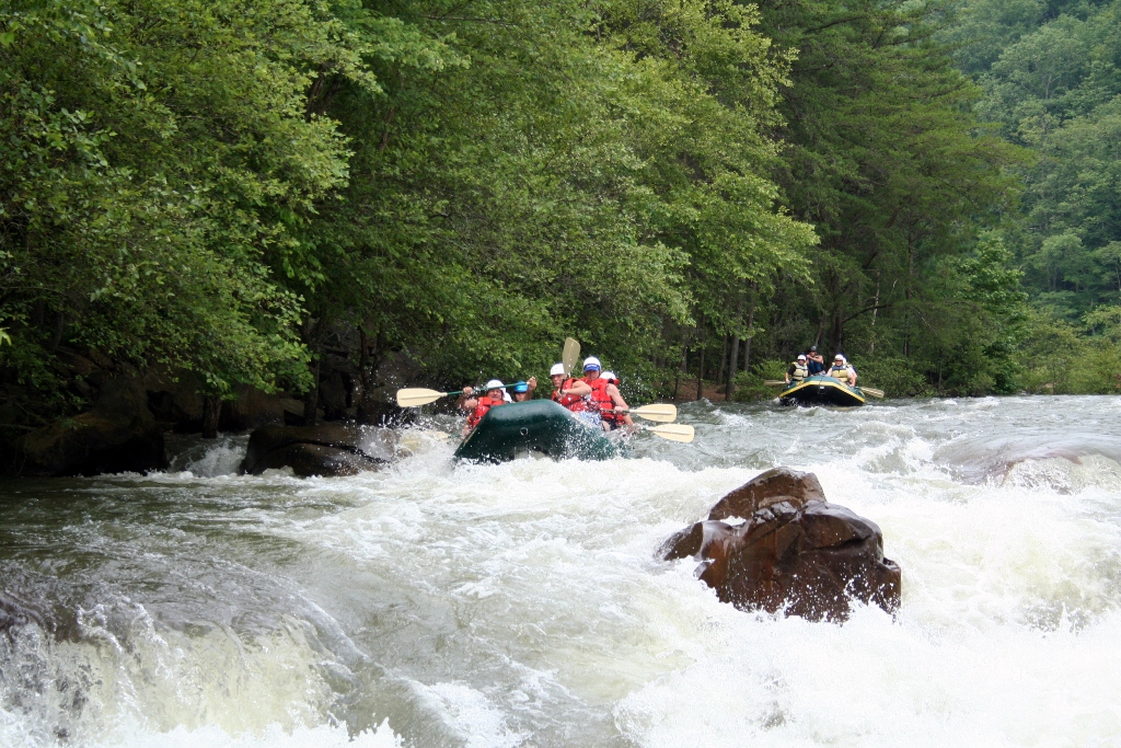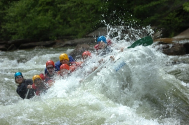 The Upper Ocoee is the steepest and meanest. It is mostly Class V and IV. These are bigger rafts, carrying 7-8 (compared to the 5 man rafts on the Nantahala), and the guides have begun on smaller rivers and worked their way up to the Ocoee. The minimum age here is higher than for rivers like the Nantahala or Cumberland and in addition to life vests the rafting companies issue and require helmets. You could bring kids rafting here on their first trip, but they'll have a lot better experience if they start somewhere else and build skills and instincts. You could come here and only raft the Middle section. That would make it a half day trip at $47 a person. But if you're only coming here once a year, we really urge you to do the full day Combination at $90 a person. It's expensive, but it's worth it. You'll talk about it, and your kids will talk about it, for years. |