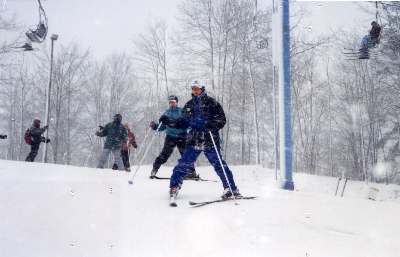 steeper and longer with a few obstacles and a full scale lift. For greater variety, ski down Wanderer and take one of the three Cascade lifts up the Middle Mountain. From the Halfway Lift, which stops at a plateau halfway up the ridge, Country Roads is a short cruising run through the woods which could be taken back to the Main Lodge. But by turning right on No Problem, a skier returns to the Cascade lift stations. |