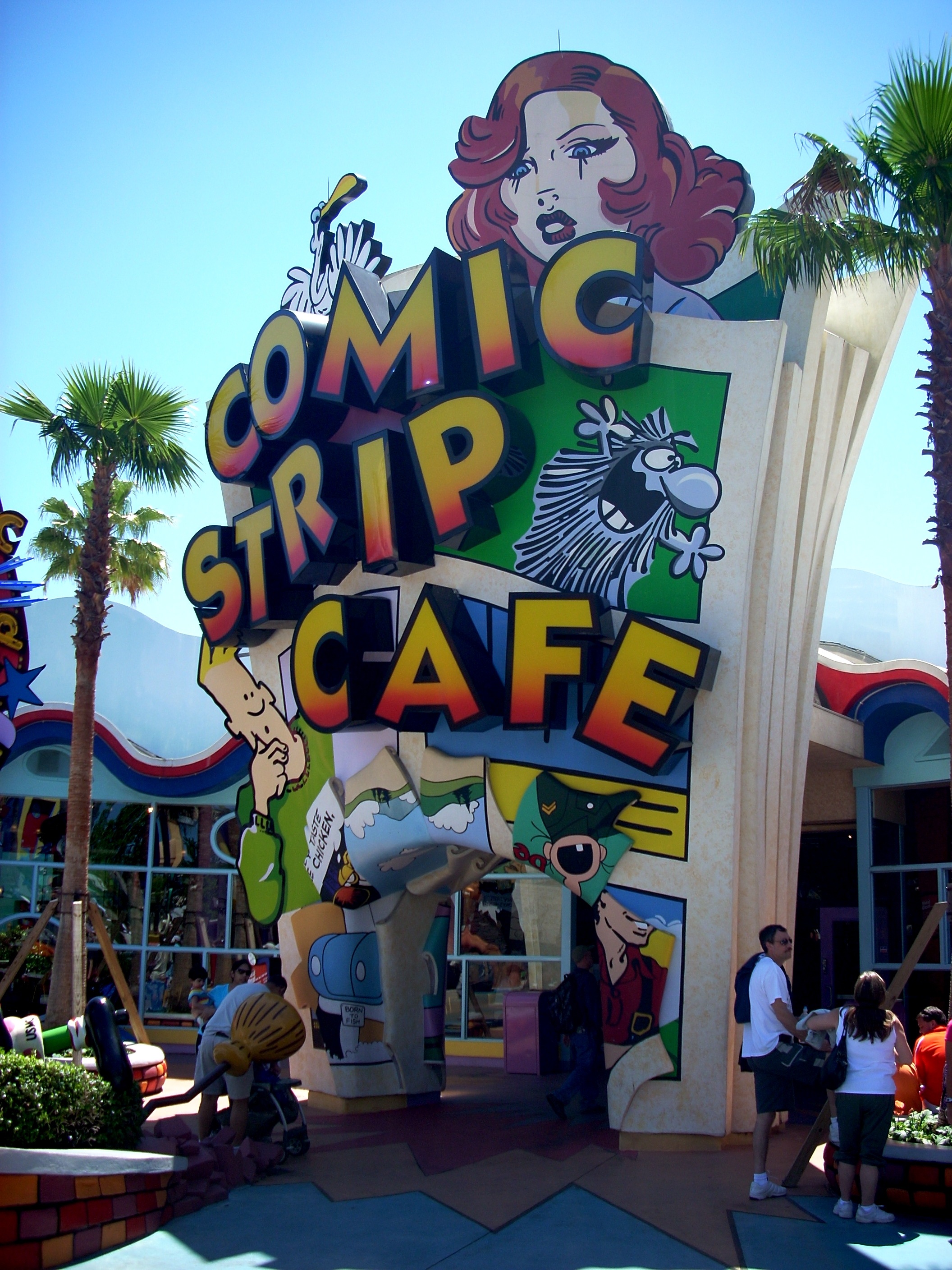 | The Comic Strip Cafe is a masterpiece of theming. You should step inside just to check out the cartoons on the walls and the general ambience. But we don't recommend it as a place to eat. You step to the counter, place your order from the menu on the wall, then get in another line to wait for your food. The menu is fast food fried. There are lots of fast food outlets out there that do a decent job at the griddle. This isn't one of them. We don't understand why a world class amusement park can fail to grasp the point that people will evaluate a park partially on the food. It would be a simple priority to make sure the people fixing this food are properly trained and supervised and held accountable. When you invest a million dollars into theming, putting $10,000 into food quality would seem a no brainer. But apparently not. | ![]() |