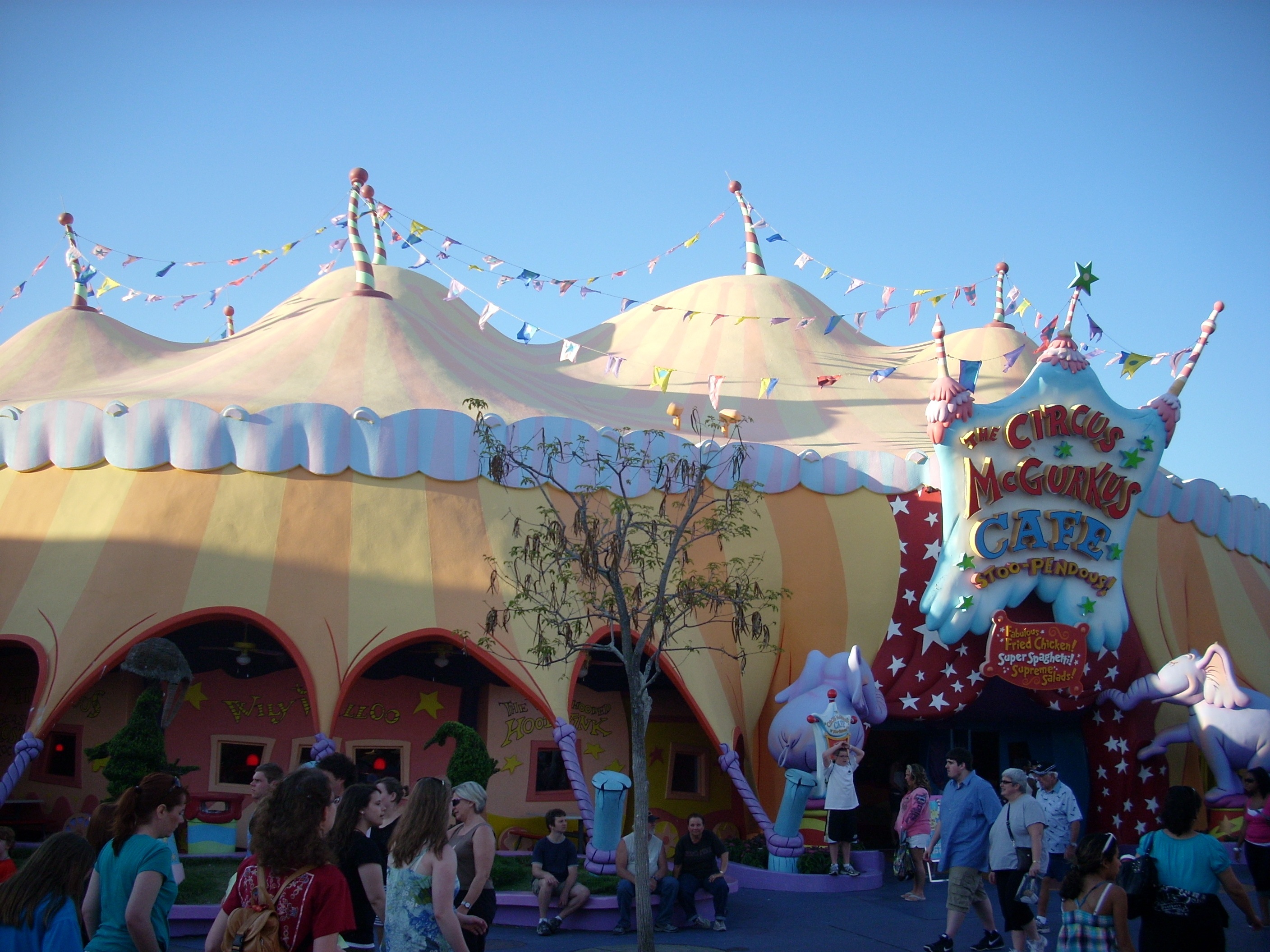The Circus McGurkus Cafe is pretty much what the name says : a circus. It is a huge, sprawling facility with long lines to get your food and people roaming around with their trays looking for a table. The decor is Dr. Seuss, and the colorful trolley train comes through every five minutes on its elevated track. Since the place has so many open doors and windows, birds peck at food scraps both on the floor and on empty tables, which kids find cute and adults find annoying. The menu is fast food. There are salads, but the rest is fried food and soft drinks. |
