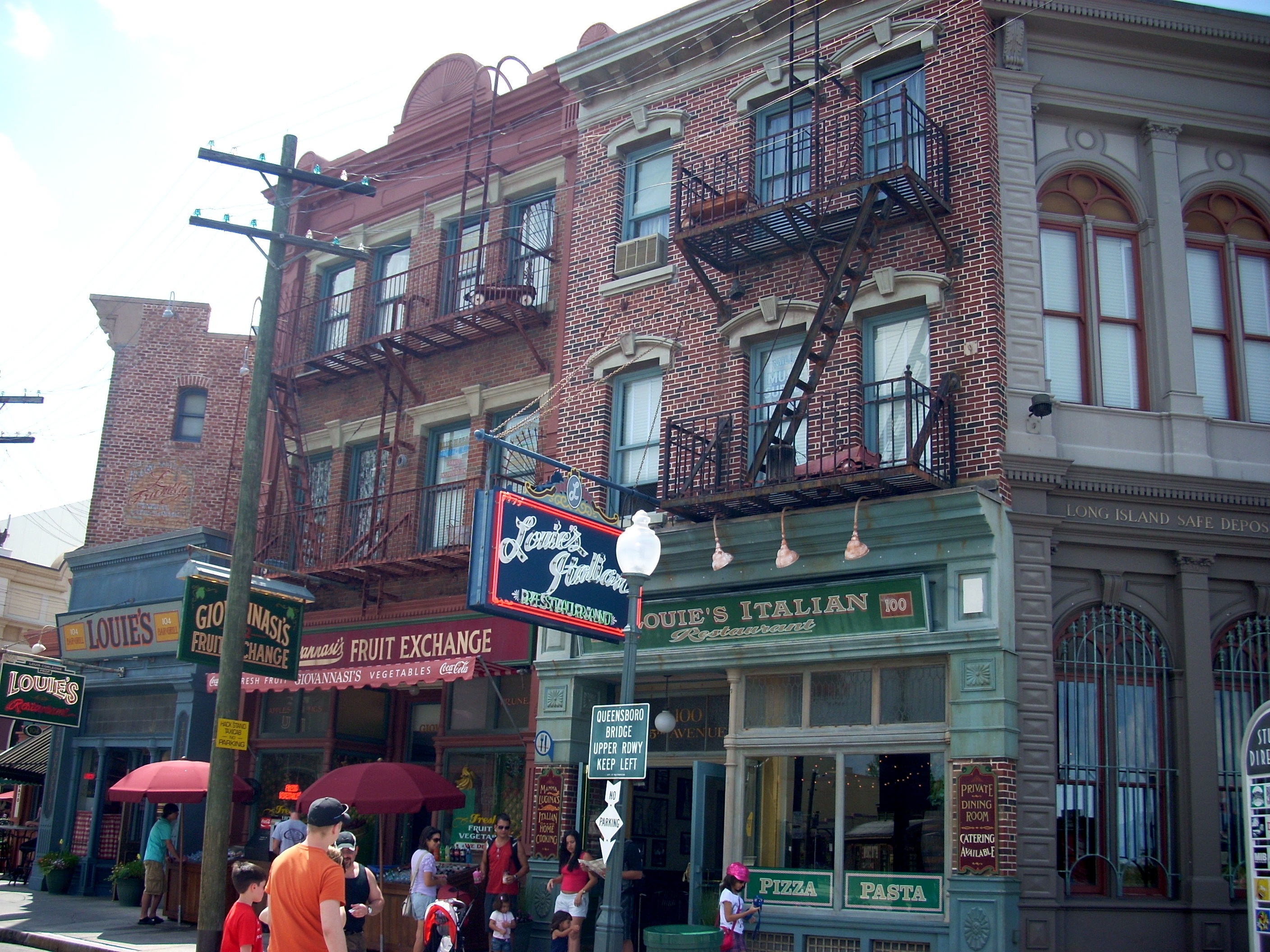 Louie's is a New York style 1950s Italian restaurant. The decor is great, as if they've created this to film Godfather movies here, an illusion which is heightened by the Godfather sound track playing softly in the background. The pressed tin ceiling, brick and wood trim, even the outside with its fire escape and authentic signing, is great for a few photos. But the food does not measure up unless you get there at the beginning of a cycle, 11 a.m. for lunch. The pizzas, pastas, and salads are actually pretty good when they first make them. But they set them out cafeteria style behind glass and under lights. Very quickly, they lose their taste. The sauces come straight from cans and when lukewarm have little appeal. The pastas become chewy and every item becomes bland. |