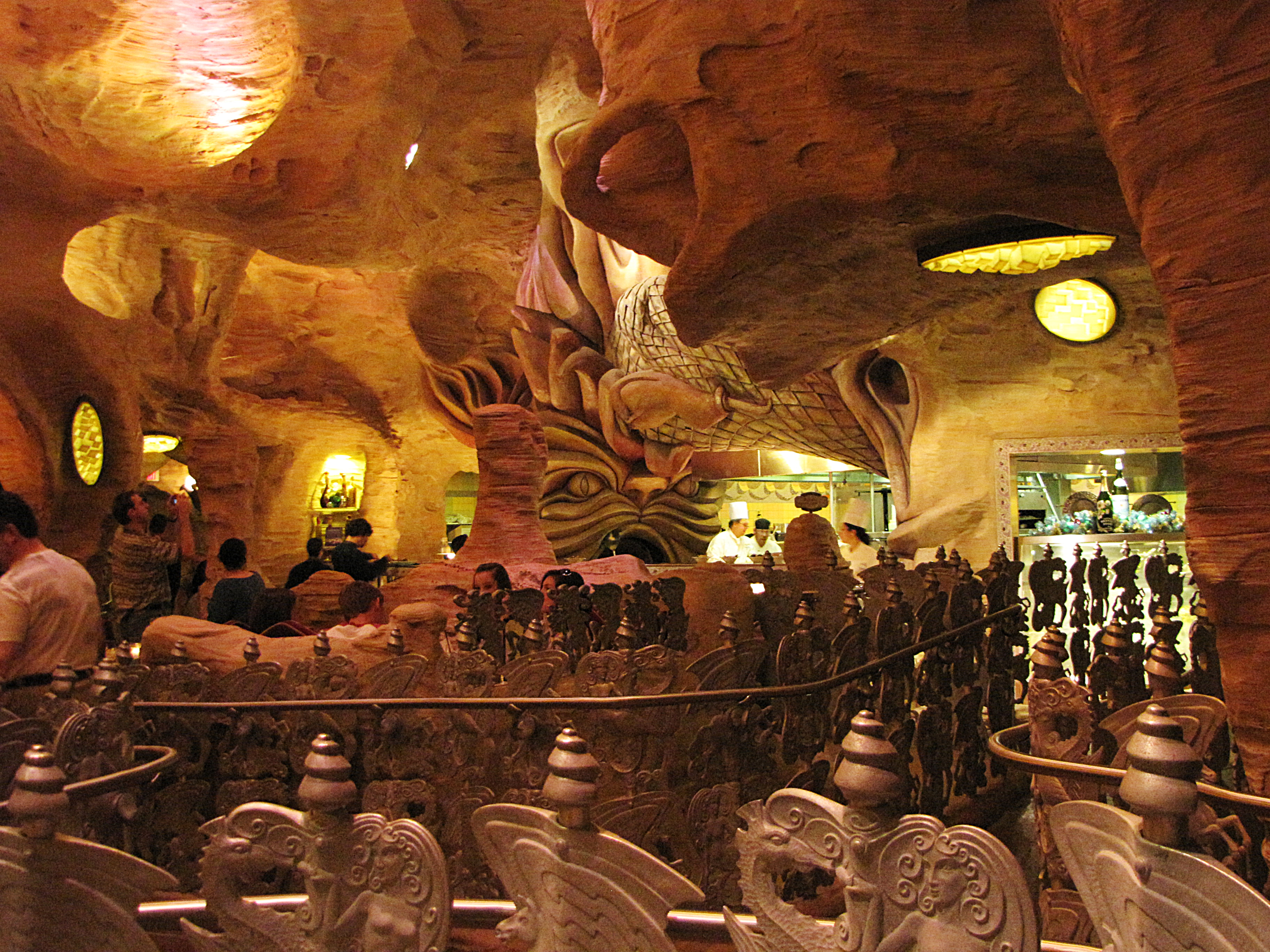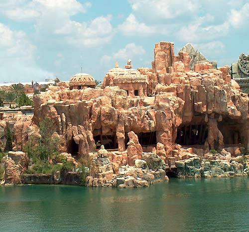If you're only going to eat at one restaurant at Universal / I.O.A. it should be Mythos, the spectacular cave in The Lost Continent. You can spend your long wait time studying the surroundings while the understaffed kitchen gets around to your order. The food has a hard time making up for the wait and competing with the architecture, but it pulls it off, Mythos having been named America's top theme park restaurant by the site Themeparkinsider. The Tuscan Tomato and Cream of Mushroom Soups are outstanding. You should definitely order a cup for an appetizer. They offer several salads, all very good. The Caesar Salad in particular is fresh and crisp. They serve a very good Risotto and be sure to order the Mushroom Flatbread. The steak is good and the herb butter that comes with it is excellent. Their signature items are their Mahi Mahi, Cedar Planked Salmon, Blue Crab Cakes and Roman Pannini. Their Pad Thai gets a lot of compliments. It's not Pad Thai. It's an American version of what Pad Thai might be like. But it's still good. Leave room for dessert. The best is Peanut Butter Ice Cream. There are wines, beers and mixed drinks. Try to get a window seat; the views across the Lagoon of Time are great. The photo directly above shows the restaurant from the outside. You definitely need an advance reservation; call at least a week ahead. Prices are more reasonable than top Disney restaurants. |