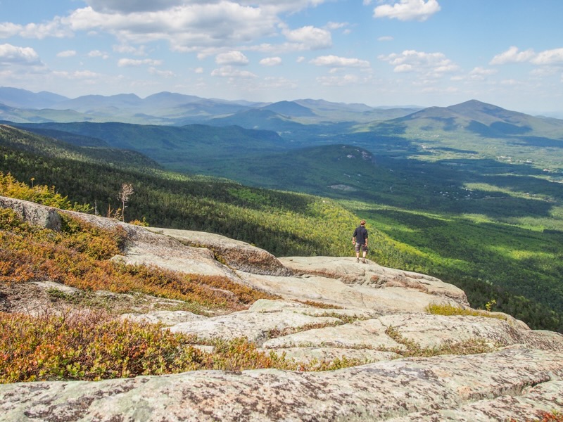 The first part of the North Moat Mountain Trail is the same as the Diana's Baths walk (see Attractions page). This is a major hike which takes all day but rewards you with spectacular views, as seen in the photo at left. There are three Moat Mountains: South, Middle and North. You could continue on the trail across the other two Moats, then drop down to the trailhead on Passaconaway Road, which leads back to Conway. That would be a 2-3 day backpacking trip. This North Moat dayhike goes up one side, then comes down by way of Red Ridge and the other side. The first 2.4 mile section follows Lucy Brook and is quite easy. Then the trail heads uphill and becomes more challenging. At 3.7 miles you climb above the treeline and the views begin. For 3/10 of a mile, the trail gets pretty steep over rocks, gravel, boulders and slabs. Then the summit, seen here at left, comes at 4.3 miles, and is a fine lunch stop. Resuming your hike, you'll come to two steep descents and a 10 foot chimney, then the intersection with Red Ridge Trail. Go left on that trail. Coming down, you'll find four steep segments over pinkish rock known as Conway Granite. It's actually a pretty scenic descent but you'll need to keep your eyes focused mostly downward on the trail. The trailhead is off West Side Road. |