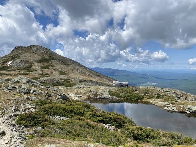Amonoosuc Ravine is the Crown Jewel of Presidential Range Day Hikes. It's the only day hike which includes one of the Huts. But it's not a first timer's hike. You'll climb 4,000 vertical feet. It requires good conditioning, proper equipment and experience in navigating rocky, windy high altitude terrain. Trailhead is just to the right of the Cog Railway Station. The first 2.02 miles are easy, but then the trail heads steeply upward and the fun begins. For nine tenths of a mile you'll be pulling yourself up very steep terrain. But at 3.1 miles you come to Lakes of the Clouds Hut (photo, right). You can stop here, enjoy the 360 degree views for a while, then either head back down, or head on up to the Summit. You could bring your own lunch or buy lunch at the Hut, which will include Soup and freshly baked bread. If you head on to the Summit, it will be another 1.5 miles of hiking. The trail between the Hut and the Summit switchbacks back and forth several times. At the Summit you'll have hiked 4.6 miles. Again, you could buy lunch at the snack bar or eat your own out on the observation deck if you hit a calm day, or inside if the wind is howling at its usual 75 mph. If you hike back down the same way, you'll cover a total of 9.2 miles. But a common strategy is to take the Cog Railway down. Don't feel guilty; you'll work hard enough on the way up to earn a comfy ride back down. |