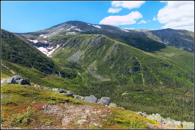 Tuckerman Ravine is one of the legendary hikes in New Hampshire, leading up the Lakes of the Clouds Hut on Mt. Washington. That's an overnighter. But this Boott Spur Loop, going partially up, then cutting across a shoulder of Mt. Washington and heading back down, is a great day hike. The photo at right shows the view from the top of the loop. From North Conway, take Route 16 north to the Pinkham Notch AMC Visitor Center, where the trailhead heads up from behind Joe Dodge Lodge. You begin by following the Tuckerman Ravine Trail upward. At 0.5 miles, you'll see the Boott Spur Loop returning on the left (south), but stay on the main trail. (You'll eventually come back down on that returning loop). Various trails will branch off to your right and left but stay on the main trail. This entire loop hike is 8.4 miles long. As you climb, you'll pass the turnoff to the Harvard Mountain Club hut, a waterfall, several sections of rock steps, and a lean to for shelter from the wind. At 3.6 miles, turn left on the Lawn Cutoff, and at 4.0 miles turn left onto Davis Path. You'll hit the Boott Spur Trail at 5.0 miles. Turn left and follow it down to the main trail. Allow eight hours for this epic hike. |