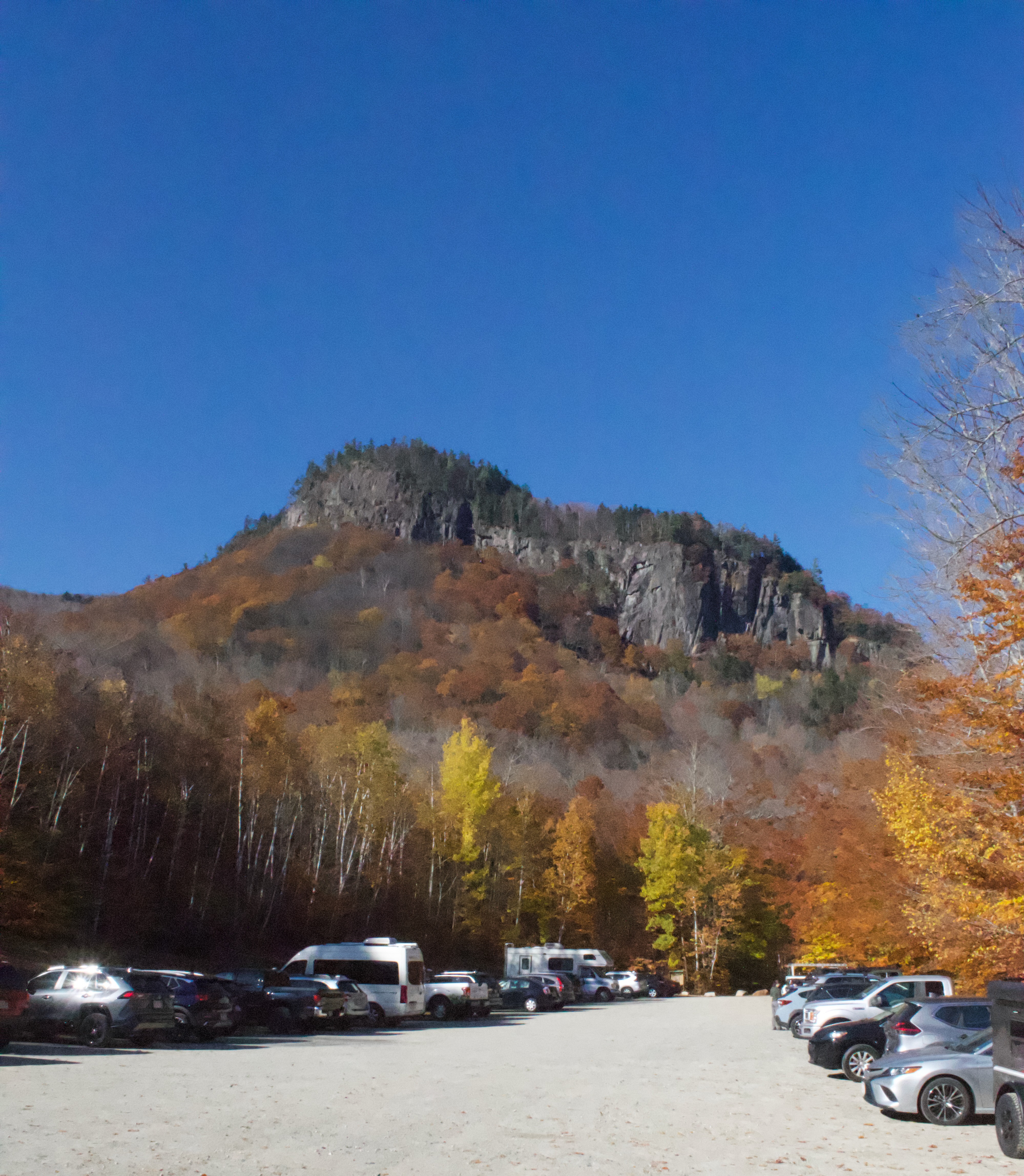 Frankenstein Cliff appears in this photo to be a steep but straightforward hike. It's not. Hidden on that mountain are two spectacular attractions : Arethusa Falls and the Frankenstein Trestle. The total hike is a 4.8 mile loop. You could just hike to the Falls, 1.5 miles out heading clockwise, or just to the Trestle, 0.6 miles out heading counterclockwise. But the expansive views lure almost everyone to hike the entire loop. The total experience will take about half a day, because you'll want spend time at the Falls, the Trestle and several overlooks plus the major one on top, which is where most people eat lunch. Try to hike this on a weekday for fewer people, and a day after a one or two day rain when the Falls, at 200 feet the highest in the state, will be flowing at its most impressive. The hike to the Falls is easy. We recommend the Bemis Brook Sidetrail, which passes several smaller waterfalls and pools before rejoining the main trail. As you near the Falls the trail steepens, crosses several small bridges, and includes both rock and log flights of steps. After the Falls the trail climbs gradually up to that saddle to the left in the photo, then steepens and climbs around the back of the cliffs. At 2.8 miles you reach an exposed rock slab on top, with great views of Mt. Washington. From here, the trail descends the sloping top of the mountain, left to right (south to north) as you can see in the photo. The trail is back in the woods, away from the cliff top. At 3.4 miles, you reach the actual Frankenstein Cliff, which is to the right in the photo. Again there are magnificent views. It's named for local artist Godfrey Frankenstein, who lived at the base in trhe 1800s. The trail down from here is very steep, which is why very few hike counterclockwise. The Trestle, which you reach at 4.2 miles, was built in 1875 and has had various pieces replaced since. It is still used by the North Conway Scenic Railroad at least twice a day.The parking lot seen at left is about 20 minutes NW of North Conway on Route 302. It's on the left as you drive toward Crawford Notch. Don't forget your parking permit as they do patrol every hour. |