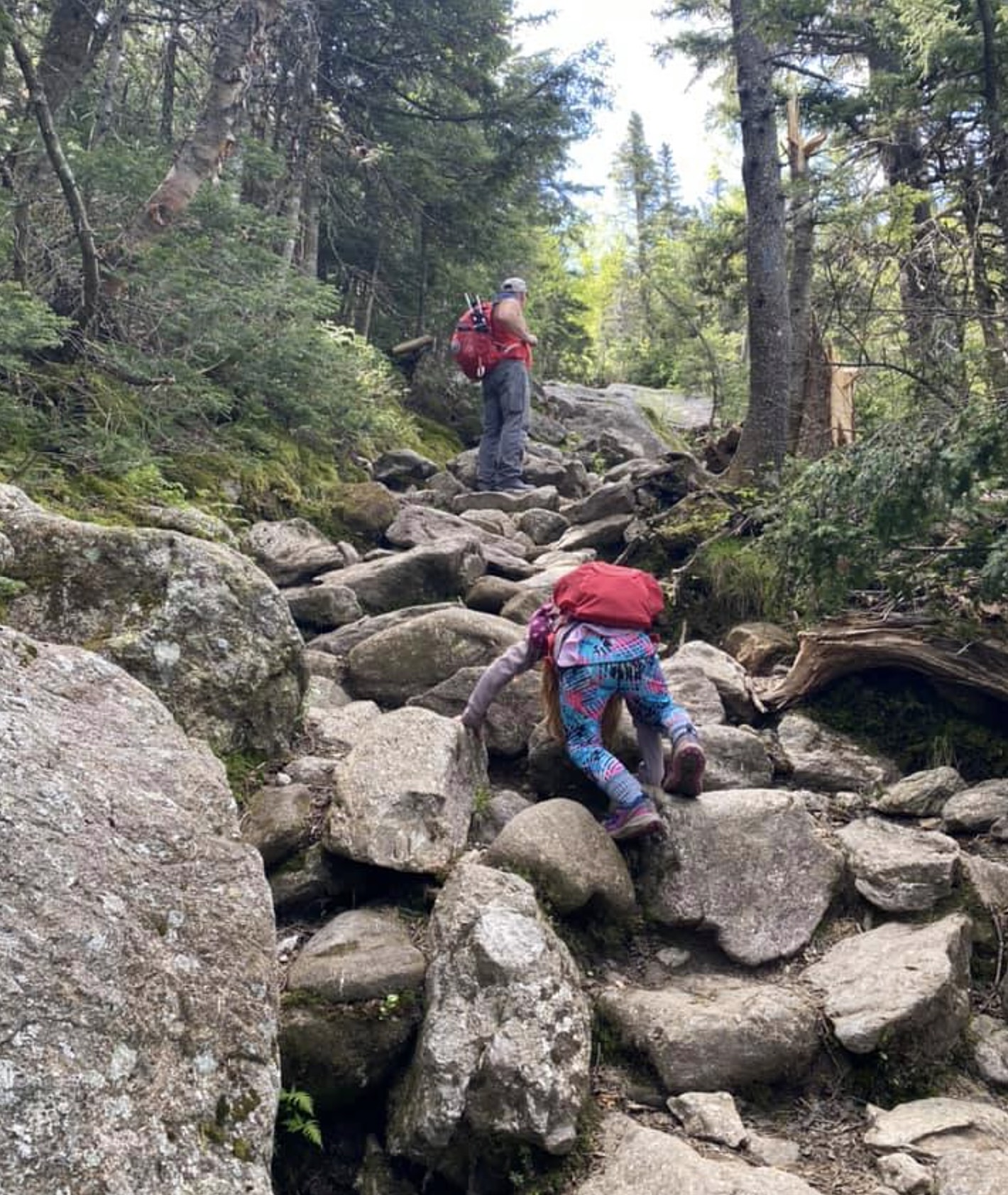 It's tempting to think of New England hiking as rather tame compared to the Rockies and Southern Appalachians with their much higher peaks and larger national parks. That is a mistake. White Mountain trails are extremely tough and the weather can turn hostile in just a few minutes. The peaks here may be lower but the trailheads are slightly above sea level, whereas out West the trailheads are at 7000 ft., so your elevation gain is often about the same. Trails elsewhere zigzag up steep gradients, sometimes switchbacking back and forth many times. Here, trails go straight up. Down South and out West you're hiking on dirt with an occasional rock or tree root. Here, you're hiking on a never ending array of boulders (photo, right), football sized rocks, gravel, and rock slabs. This is why sprained and sometimes broken ankles are so common here and why so many hikers have to be helicoptered out. And it's why locals don't use the word "trails" but instead talk about "routes." While a good day's hike down South or out West is 8-10 miles, a good day's hike here is 5-8 miles. You can't make much time scrambling over rocks, pulling yourself up granite slabs and navigating gnarled roots and steep slopes of gravel. Terminology changes here. When you're travelling on mostly level land on mostly dirt, the locals say you're "walking," as in "out for a walk." It's not "hiking" here until you're going UP, on mostly rocks. "Hiking" here is not a relaxing activity. Instead, it's a real athletic event, intense, requiring a hiking staff or hiking sticks. You have to be in decent condition and expect to return to the trailhead exhausted. You don't see many fat people here. Do not bring quasi basketball shoes. You need real hiking boots, like the Vasque Sundowner, made of high quality leather, with a scree collar and Vibram sole. The sharp rock edges here will shred a nylon or canvas boot in just a few days. The hikes we're recommending are relatively mild and mostly below tree line. Their trailheads are also a short drive from North Conway. Once you're completed these warm up hikes, you can advance to those more challenging on a future trip. |