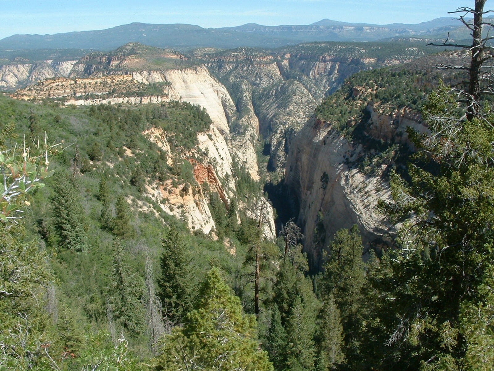 The challenge is getting to the trailhead. Fortunately, the Mystery Canyon popularity among canyoneers led Zion Adventures to long ago set up a daily shuttle to the trail head, and thanks to Ponderosa Lodge, there are passable roads for anyone wanting to drive it. To get there on your own, go out the East Entrance to the park. Roughly 1.7 miles east of the Zion National Park border along Route 9, turn north onto the paved North Fork Road and follow it for 5.4 miles, then turn left onto the dirt road that heads west under the Zion Ponderosa gate. Follow the main Pine Angle Road as it heads west and then north towards the trailhead. As you approach that trailhead, be careful. The last half mile, the road drops down a very steep hill which may not be suitable for your vehicle. You might be prudent to park at the top of that last hill and walk down to the trailhead. The trail is three miles one way. It's interesting because it passes through a classic fire adapted ecosystem. Lightning strikes often up here on the high plateau, and fire is very common. The fire keeps the understory cleaned out. Large amounts of dead wood do not build up,so the fires never become too big. Ponderosa trees have thick bark which insulates them from moderate fire. Ponderosa seedlings are adapted to thrive in openings created by the fires. Manzanita is fire adapted. It benefits from frequent burn overs. So as you're hiking, notice how this entire ecosystem has evolved to prosper in a fire based environment. But you'll have other views. First, to your right (north), in the distance, will be the 10,000 feet high Pink Cliffs. The cliffs are basically Limestone, which has been colored by Iron and Manganese. After about 2.0miles, you'll see Mystery Canyon opening out to your right. You'll see the view in the photo below, but there are trails leading over to it. If you follow one of those you'll see the view here at right. |