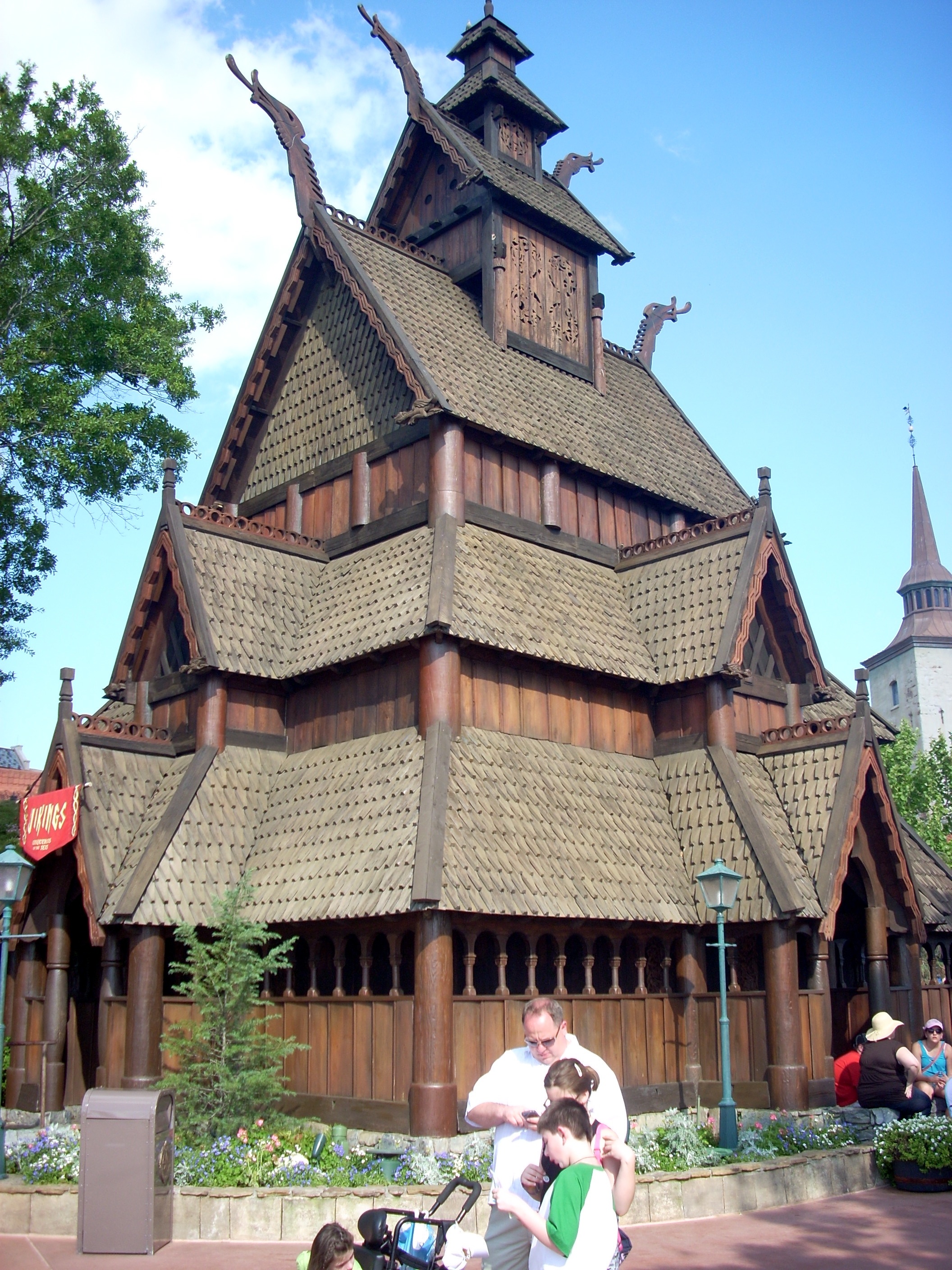 Akershus is famous for its Princess banquet with Snow White, Auriel, Aurora, Cinderella, etc. It's easier to get reservations here, and the princesses spend more time with each kid. Waitresses all seem to be blonde, blue eyed beauties with heavy Norwegian accents, so males find the place enchanting. But behind all this glitz is exotic but delicious food. You order off the menu, then go to the buffet for a first course to hold you while your meal is prepared. But the buffet is a meal in itself, with salads, desserts, cheeses, berries, fruits and seafood. Norway is famous for fish pulled from the icy waters of its Fjords, North Sea and North Atlantic. You can try Smoked, Baked and Fresh Salmon, Pickled Herring, Peppered Mackerel, Klippfisk (Salted Cod), Rekesuppe (Shrimp Soup), and Norwegian King Scallops (considerably larger than most Scallops, matched only by the Digby Scallops of Nova Scotia, and generally thought to be the finest Scallops in the world). The stars of the main menu are the Portabello Mushroom Ravioli, Cheese Potato Casserole, Cauliflower Garlic Soup, Beet Salad, Kjottake (Norwegian Meatballs), and Lox (thinly sliced salmon, cream cheese, onion and tomato served on a bagel). However, for those preferring something less exotic, there are Roast Chicken, Beef Tips, Pork Tenderloin, Wild Turkey and Vegetable Soup. The Pomegranate Lemonade is delicious and they offer an outstanding Wild Berry Margarita. The classic Akershus dessert is a Trio, with a Sorbet, Chocolate Cake and Danish Pastry. We have Orlando friends who eat here often, and their strategy is to order the Vegetable or Cauliflower Garlic Soup off the main menu and consider the buffet the heart of the meal. However, an annoying quirk of the restaurant is to bring your main meal before you have time to eat the buffet items. Normally, fast service is a good thing, but this can be negative. So as you enter, take a good look at the buffet. If you see lots of items you want to try, emphasize to the wait staff that you want your main meal delayed to give you time to finish the buffet first. The building at right is not the restaurant. It's the iconic medieval Lutheran stave church, a replica of the one in Sikorsk. The restaurant is behind this. |
