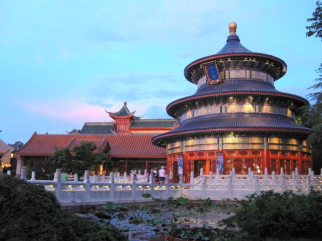 We list Epcot separately because it's such a special place, a cross between an amusement park, a food mall and a gigantic bazaar. The nationality restaurants at Epcot are among the best ethnic restaurants in the nation. They employ natives of the countries (the Norway Pavilion alone hires 150 on six month rotations), have researched the cuisine they serve, and have gone to great lengths to create authentic environments by carefully manipulating the historic icons and artifacts of those cultures. Adults with park hopper passes could spend the week coming over to Epcot every evening for dinner at a different restaurant, perhaps adding one ride before dinner and shopping after dinner each time. As usual, reservations are almost essential to avoid 90 minute waits. We also recommend eating early, around 530-6 pm. This would give you time before for one ride, and afterward for a leisurely walk along the lake, shopping in the nationality gift boutiques, and the nightly fireworks display, which is impressive and worth more than one viewing. Our restaurant listing below proceeds in clockwise order around the lake, the same order you would experience if you came in under the geodesic dome and went to the left.