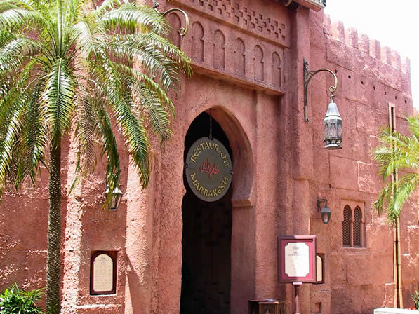 Marrakesh serves Moroccan cuisine with music and belly dancers. Of all the Epcot restaurants, this one does the best job of creating the illusion you've stepped into another world. The building with its large pillars and high vaulted ceilings is patterned after a 12 Century Mosque in Marakesh. This could easily be a movie set for Humphrey Bogart or Indiana Jones. The Farsi speaking servers enhance this image. And the food lives up to it. There are Moroccan Beers and Wines, a Moroccan Coffee, and iced or hot Mint Tea.. Appetizers include a Minced Beef Cinammon Pastry, several Salads, and Harirra Soup. Harirra is a delicate mix of celery, lentils, tomatoes, rice, onions, lemon, paprika, cinammon and diced lamb. This is a very good soup. Sadly, they've dropped the popular Curry Chicken. But they still offer the famous Sampler Platter (lamb shank, lemon chicken and roast vegetables). Other signature entrees are the Mussels, Seafood Bastilla (phyllo dough layers stuffed with seafood), Mixed Grille (one lemon chicken brochette, one beef brochette and two sausages), Roast Lamb with Rice, Shish Kebab, Chicken Tagine, and Vegetable Couscous. There are several tasty Breads, and three desserts : Baklava, Mint Ice Cream With Fruit & Orange Water, and Dessert Bastilla (almonds, vanilla and ice cream wrapped into cakelike phyllo "leaves"). |