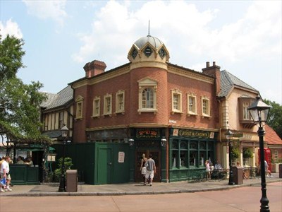 The Rose and Crown is a classic British Pub with a great collection of imported beers, ales and stouts. But it has excellent food, too. The place is famous for several things, beginning with Carl the bartender. Supposedly, at Epcot restaurants, the staff are continuously rotated in six month shifts from the home culture, in this case England, Ireland, Wales and Scotland. It thus remains a mystery how one man, Carl, has defied this and remained at Rose & Crown since 1985. He has his own cult following. Disney loyalists drop by once or twice a year just to quaff a brew with Carl. He is the resident expert on brews, able to advise patrons on Ciders, Blacks, Strongbow, Harp and other brands. There's a beer sampler which is very popular. However, on to food. The menu is limited here, but the best items are very good. Among starters, the Apple Salad, Leek Soup, and Scotch Egg (hard boiled, then fried) are best. Of the entrees, the most famous are the Shepherd's Pie, Bangers & Mash, and Fish & Chips (with salt and vinegar). But the Roast, Corned Beef Sandwich, and Pork Loin are good, too. And then there's Yorkshire Pudding. This is a uniquely British treat. Originally called Dripping Pudding, it is made from the drippings collecting in the pan below a roast. Milk, flour and eggs are added, the mix poured into muffin tins and baked into four inch pies. It's a standard Sunday lunch treat in England. Desserts here include Caramel Custard, Cheesecake, and Bread Pudding, but skip those and take the Toffee Pudding. It tastes like a Heath Bar. |